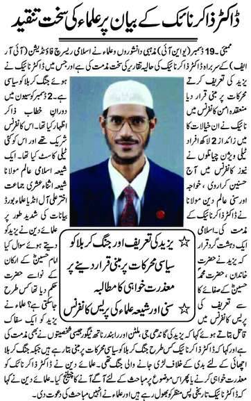ब) वह यज़ीद की तारीफ करता है और उसके लिए प्रार्थना करता है – यह जानते हुए भी कि करबला की लड़ाई में पैगम्बर के नाती के कतल के लिए यज़ीद ही जिम्मेदार था और उसके बाद हुए कत्लेआम – जिसमें हजारों जानें गईं और हजारों बलात्कार हुए – का कारण भी यज़ीद ही था। देखें –https://www.youtube.com/watch?v=1mMQbR_48IU.